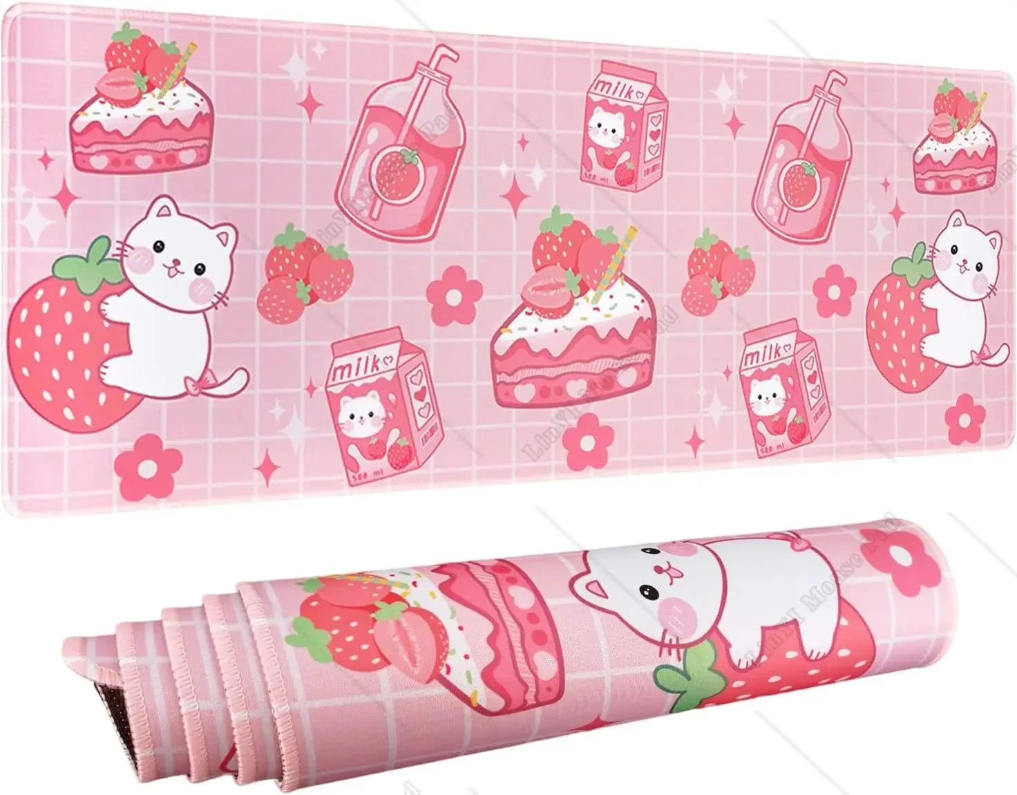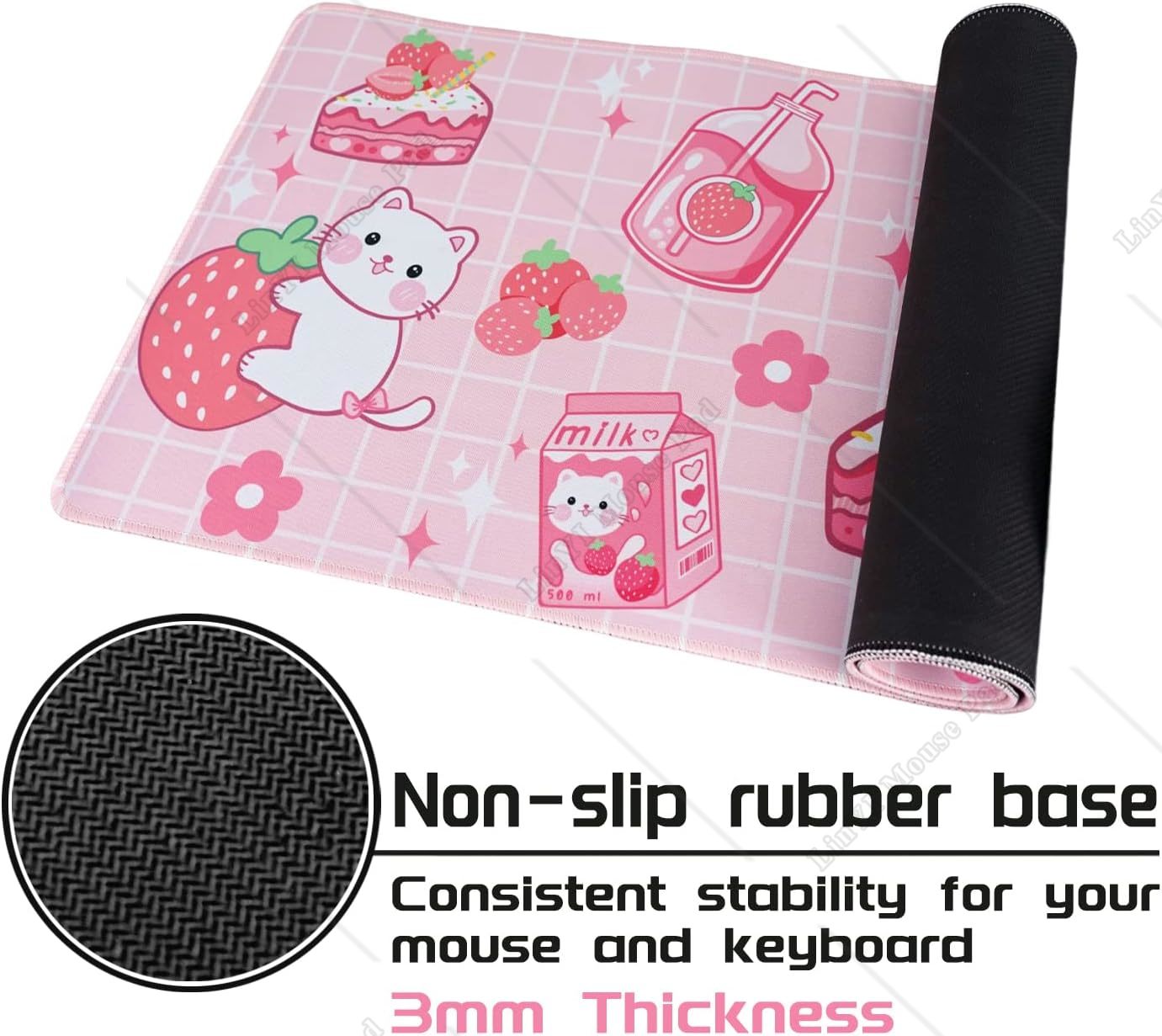 Kawaii Gaming Mouse Pad Large Cat Strawberry Milk Mouse Pad Pink XL Cute Anime Mouse Mat Kawaii Strawberry Decor 31.5 X 11.8 In